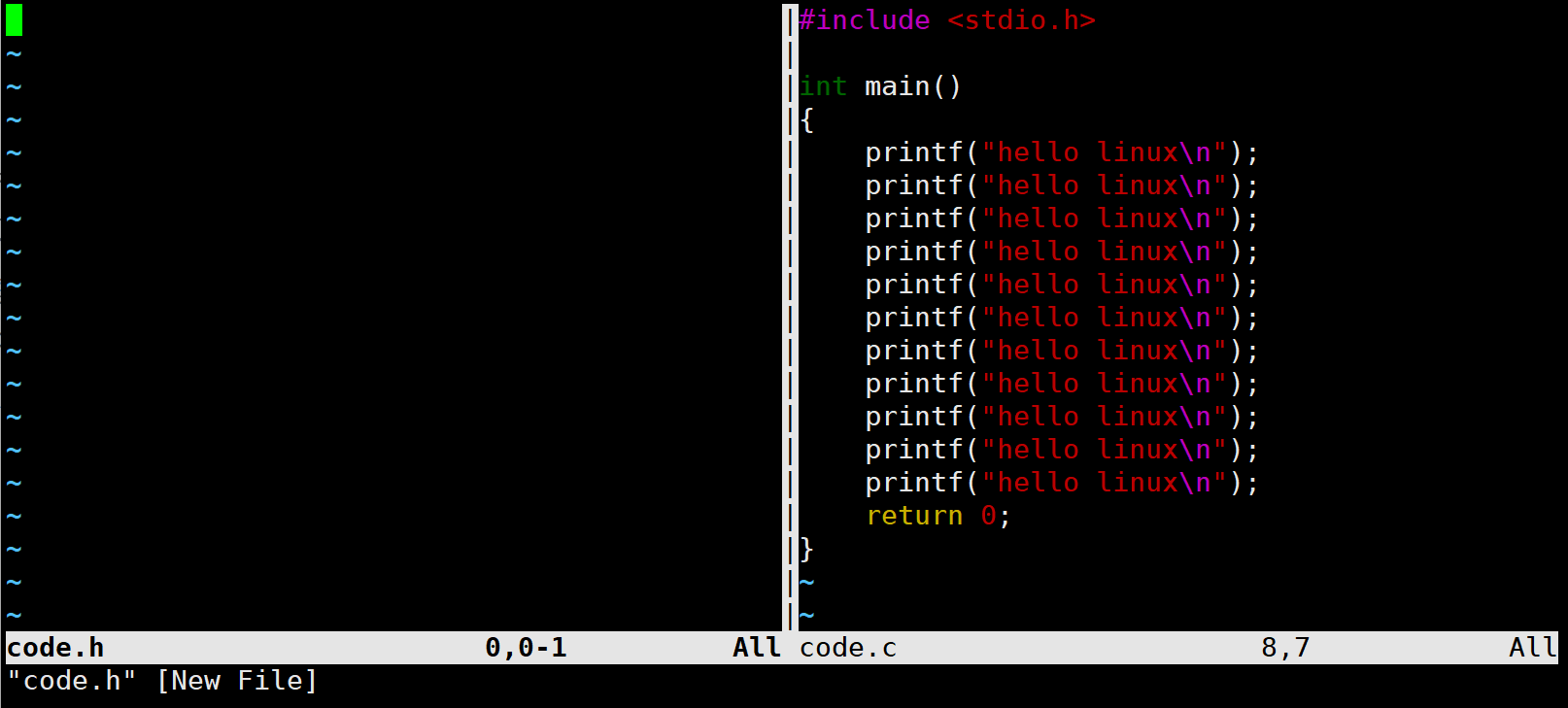 21. vs 文件名 在底行模式可以多文件分屏操作,例如一个code.h头文件和一个code.c源文件,共同编写