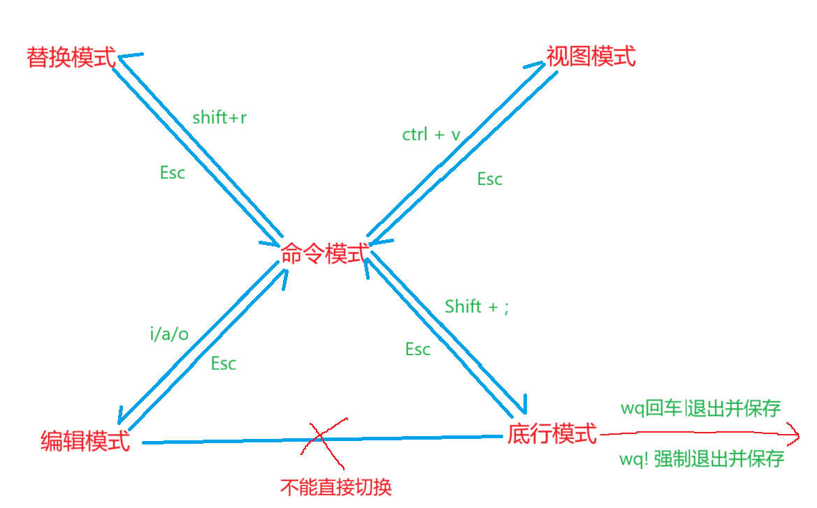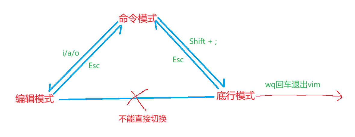 注意:编辑模式和底行模式之间不能直接切换,必须通过命令模式作为"桥梁"进行中转。