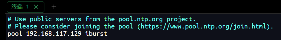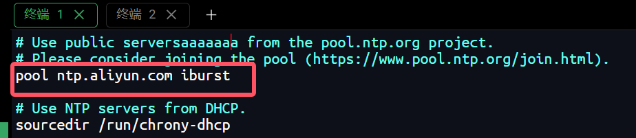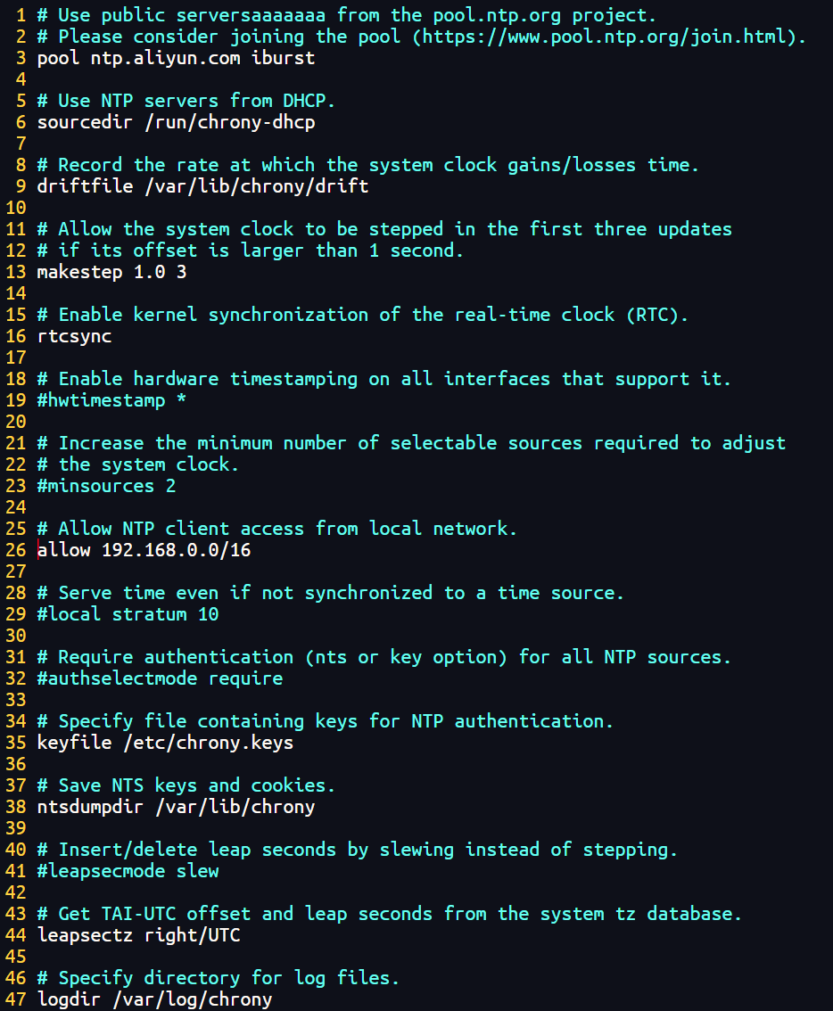 注意:也可以先清空chrony.conf内容,将阿里开源提供的时间服务器推荐配置复制粘贴到该文件中