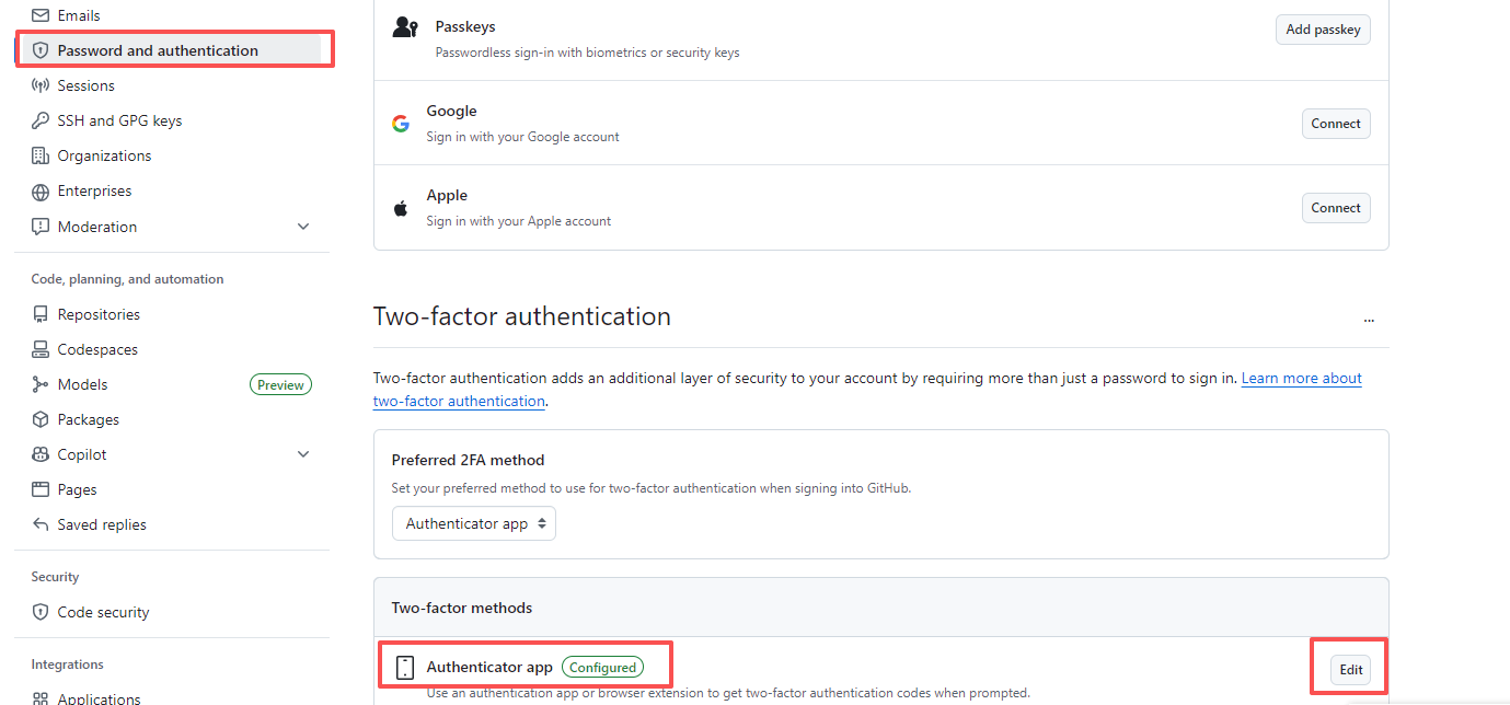 如下图,进入点击settings, 然后进入 Password and authentication 页面,再点Authenticator app 这里 ,点击Edit ,