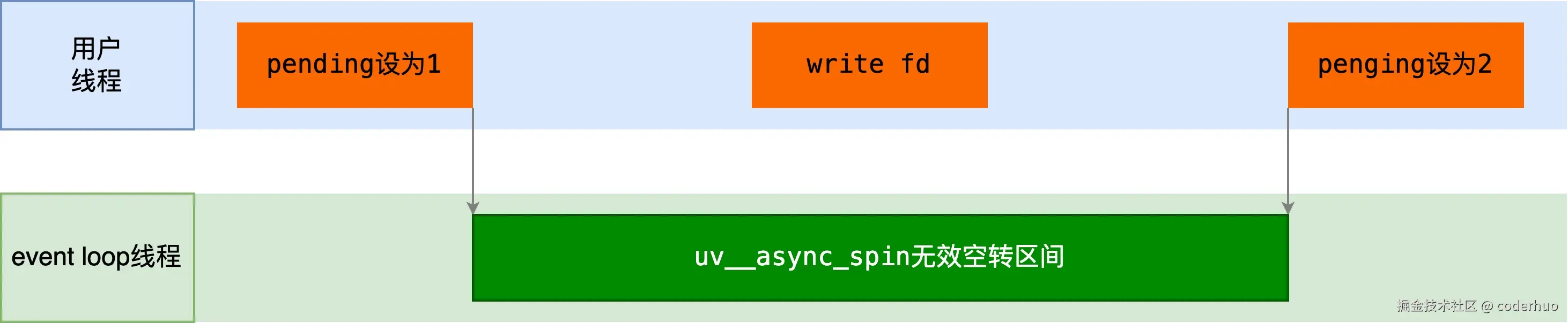 handle->pending当前的值是1,啥也不干,返回当前值1;(意思是uv_async_send正在被调用),注意这种情况下uv__async_spin会一直等待直到handle->pending的值变为2,即uv_async_send调用结束,这为本文描述的bug埋下了伏笔。