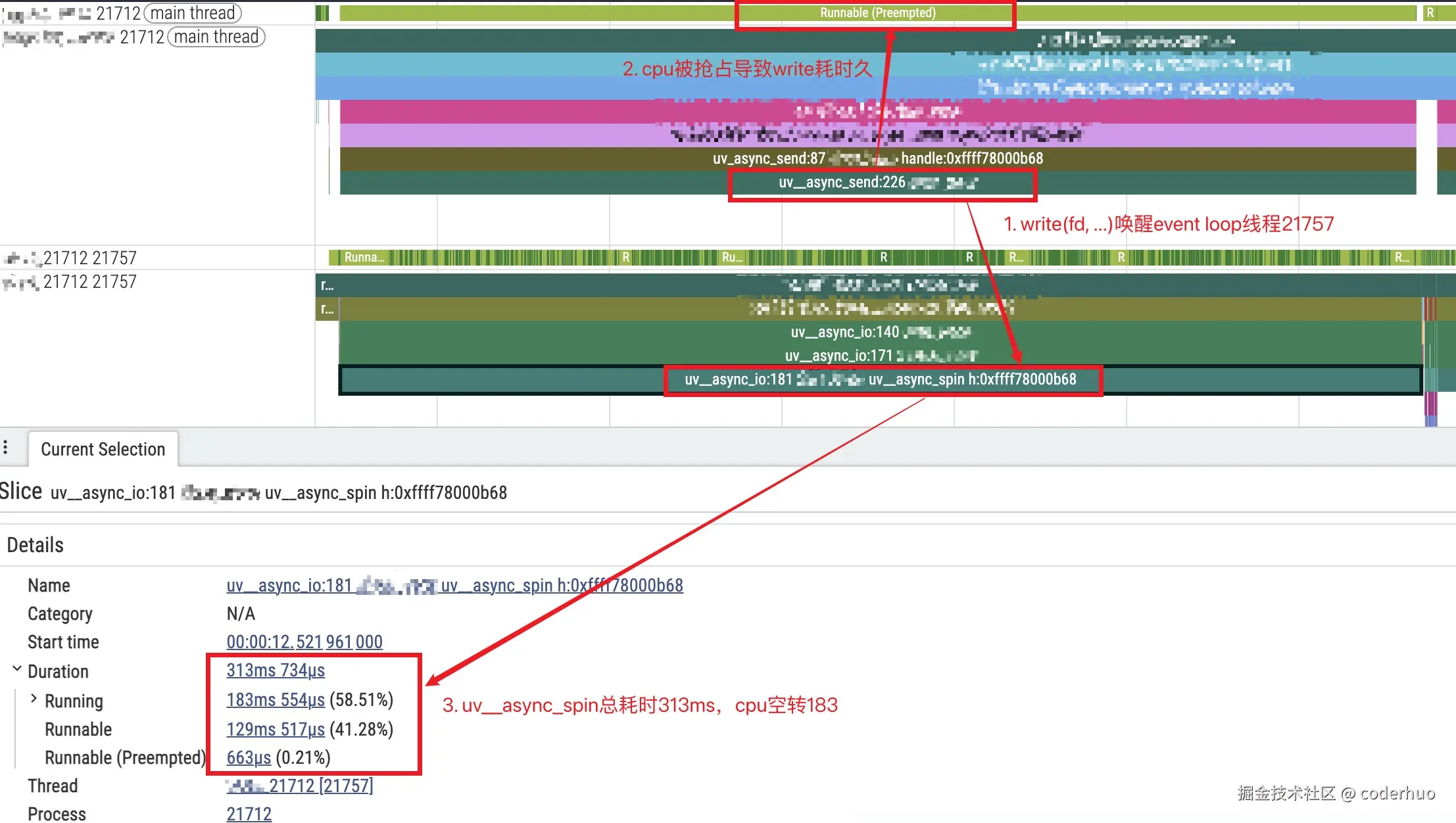 uv__async_send中调用系统函数write写pipe时cpu被抢占 event loop所在线程21757在事件循环中检测到handle->pending状态为1,也就是uv_async_send正在被调用,所以在uv__async_spin中自旋等待- 最终的结果就是,uv__async_spin总耗时313ms,cpu空转183ms