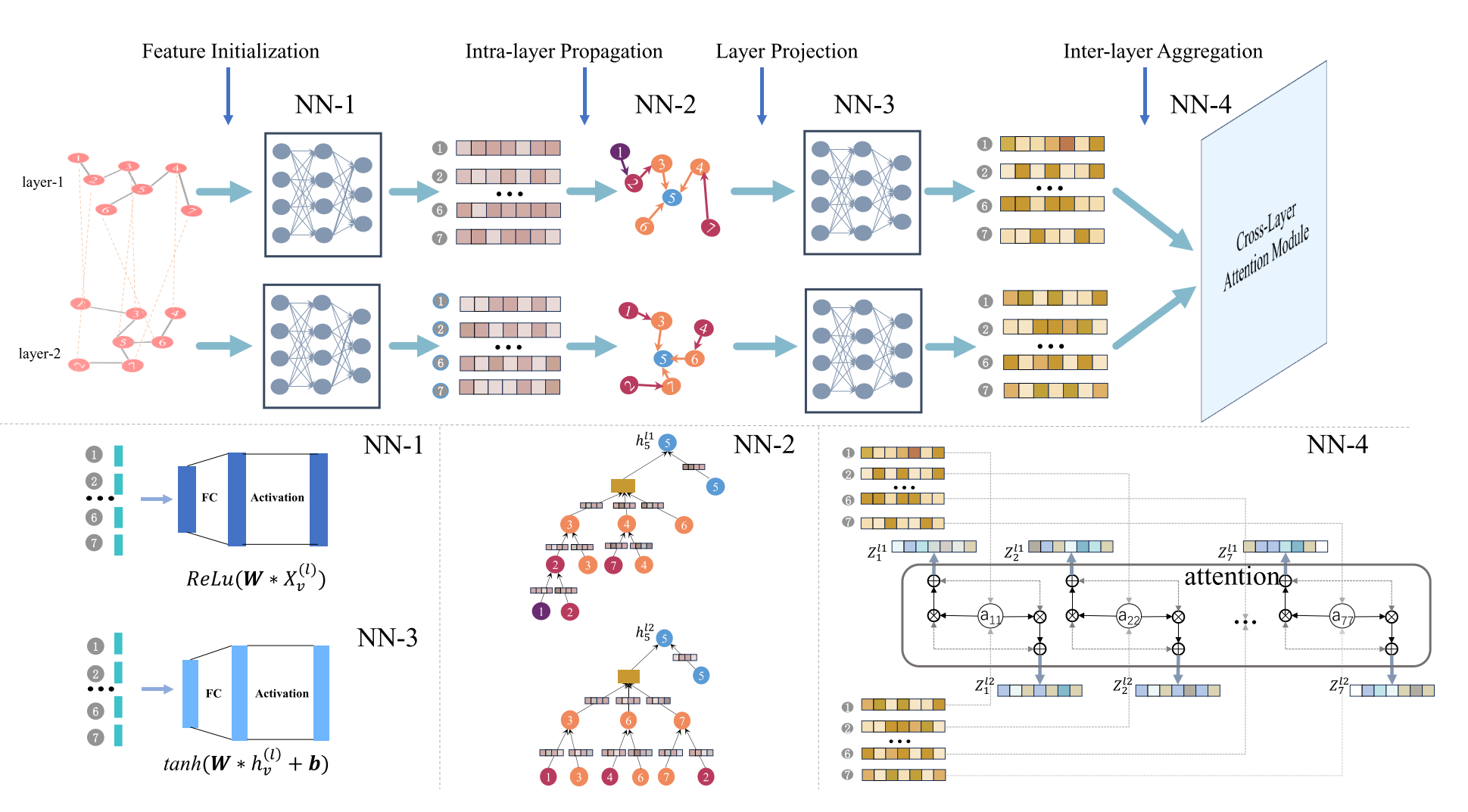 用于对多层网络进行表示学习,捕捉层内和层间的结构信息。包含: