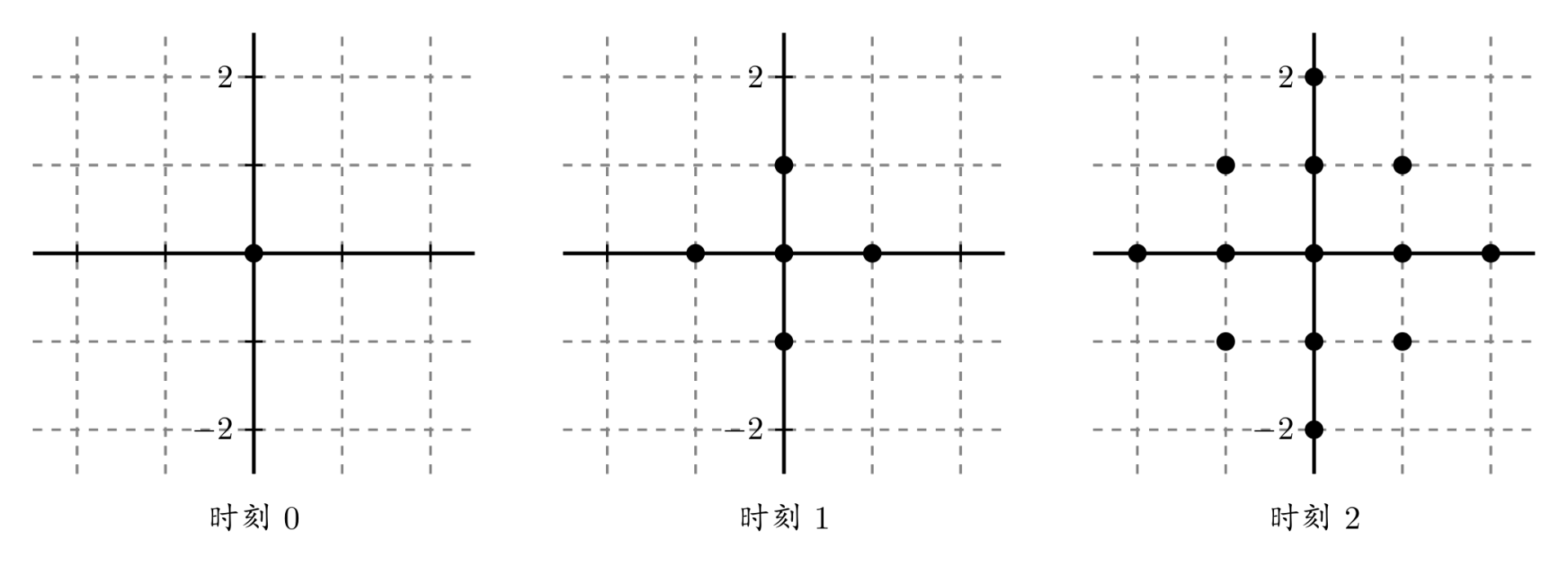 一个点每过一个单位时间就会向四个方向扩散一个距离,如图。