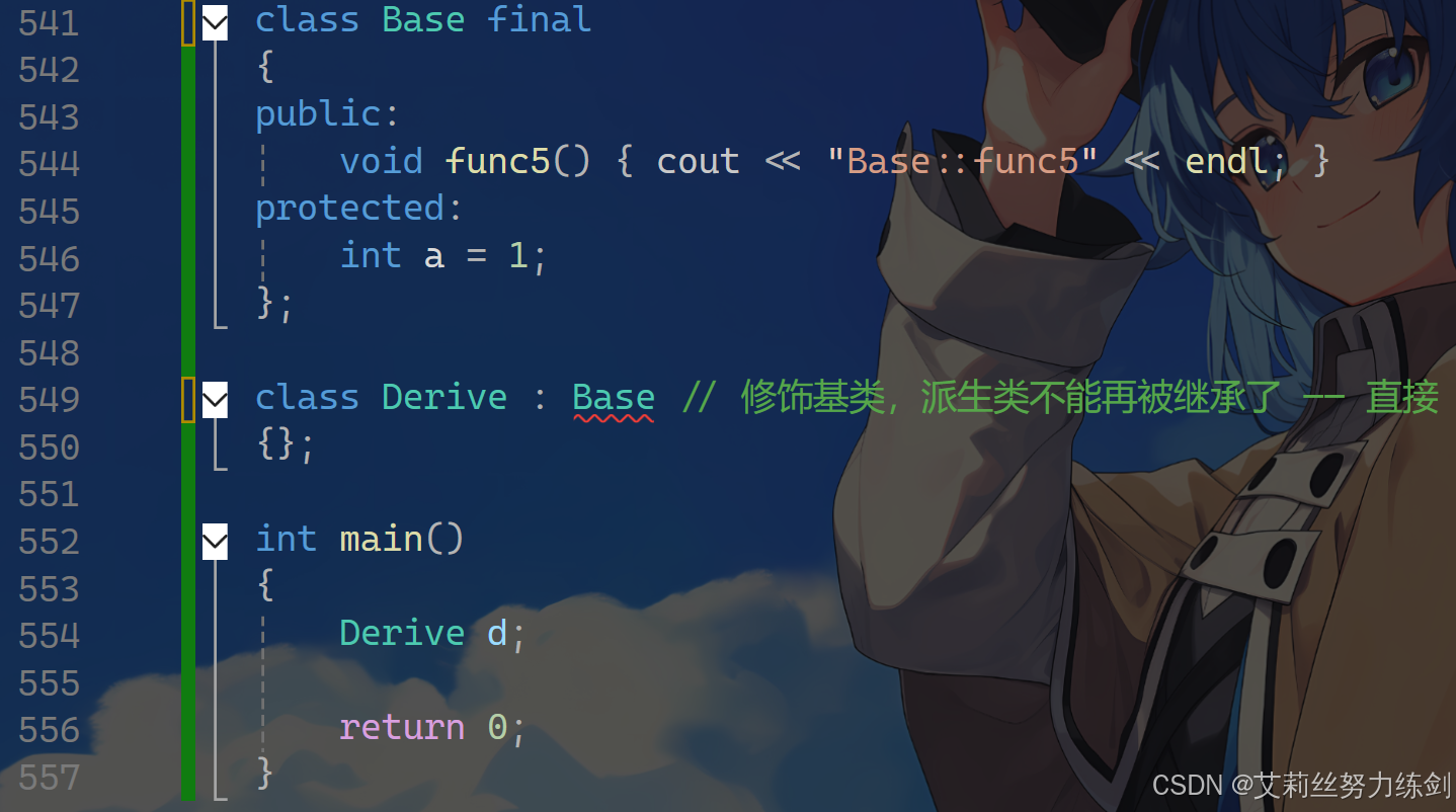 class Derive : Base // 修饰基类,派生类不能再被继承了 ------ 直接