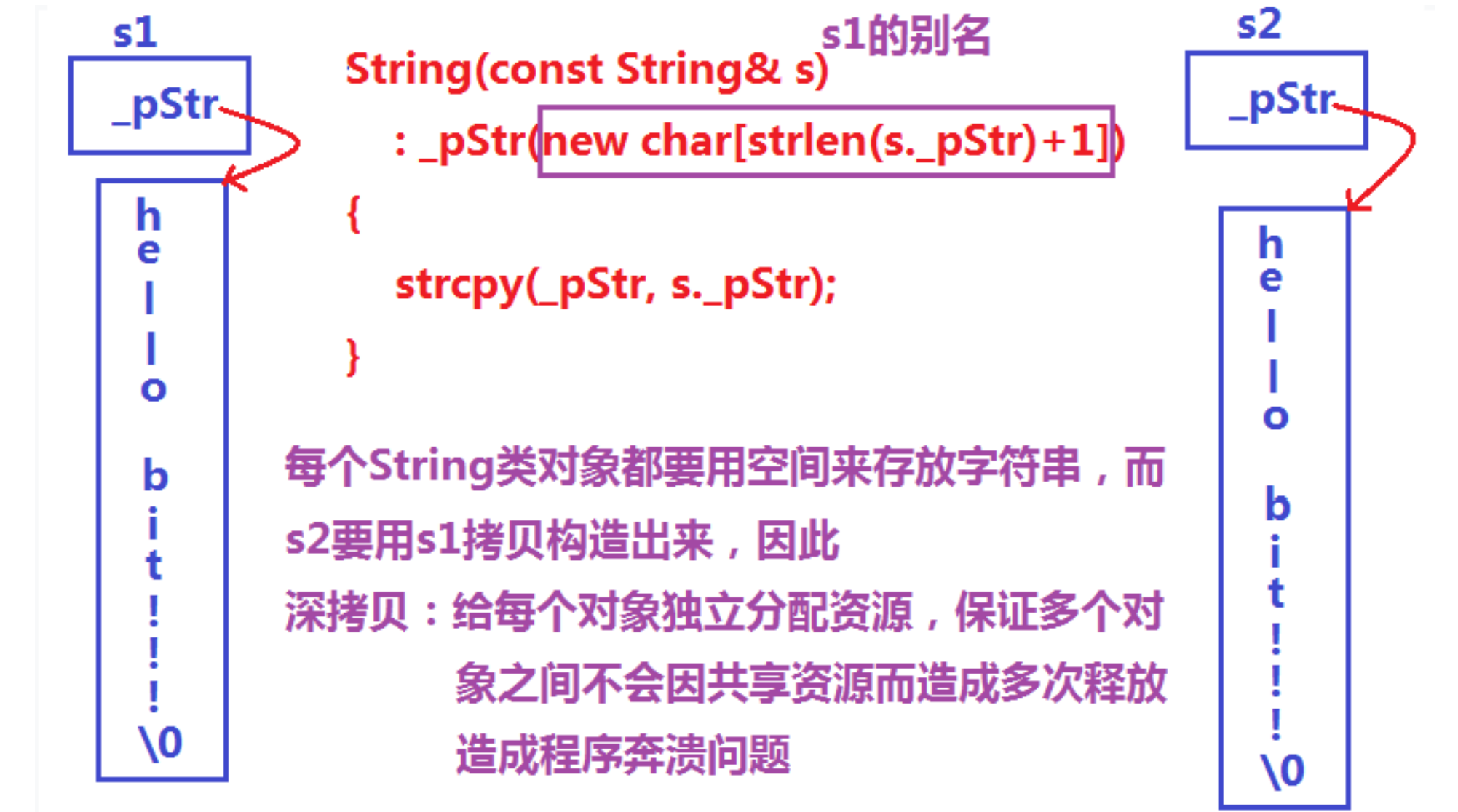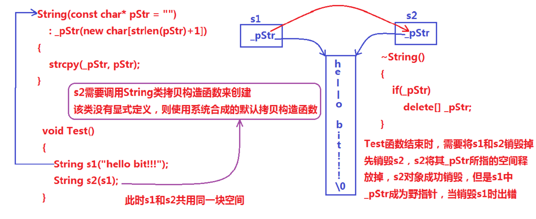 说明:上述 String 类没有显式定义其拷贝构造函数与赋值运算符重载,此时编译器会合成默认的,当用 s1 构造 s2 时,