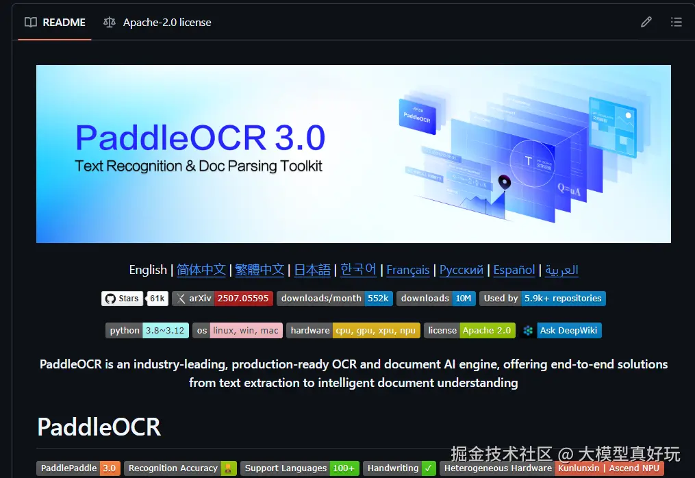 PaddleOCR 是目前工业界应用最广泛的开源OCR工具库之一,坚持采用成熟的两阶段架构 (检测→识别),并为不同阶段提供了丰富的模型选择。在文本检测方面,支持 DB、EAST、SAST 等多种模型;在文本识别方面,则提供 CRNN、SVTR、PP-OCRv4 等选项,兼顾精度与效率。其最大优势在于丰富的垂类场景适配能力 ,包括表格、票据、手写体等专项优化模型,以及完善的工具链生态,覆盖从数据标注、模型训练到多端部署的全流程。