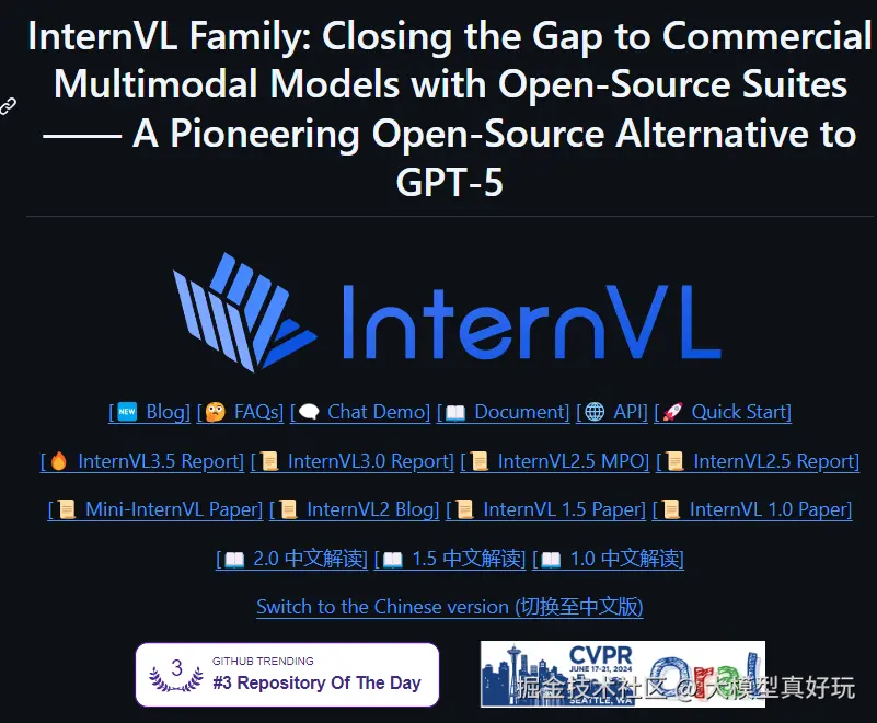 2023年以来,大模型技术的爆发彻底改变了深度学习的格局。以GPT-4V、Gemini、Qwen-VL、InternVL等为代表的视觉语言模型(Vision-Language Model, VLM) ,让人工智能真正具备了"图文双修"的能力。