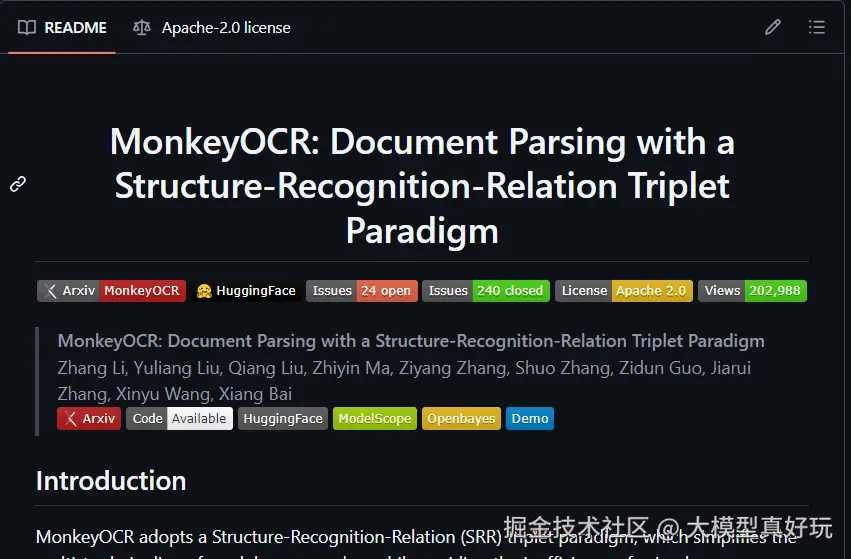 MonkeyOCR 创新性地提出 Structure-Recognition-Relation (SRR) 三元组设计理念 ,在传统管道方法与端到端方法之间取得了良好平衡。该模型首先通过 DocLayout-YOLO 进行文档结构检测与分块,随后使用轻量级LLM对每个文本块进行识别,最后基于整体文档结构预测各区块之间的逻辑关系。这一设计既避免了管道方法中的错误累积问题,又显著降低了端到端方法的计算负担,使得模型在单张3090显卡上即可高效部署,在复杂版面解析任务中表现出色。