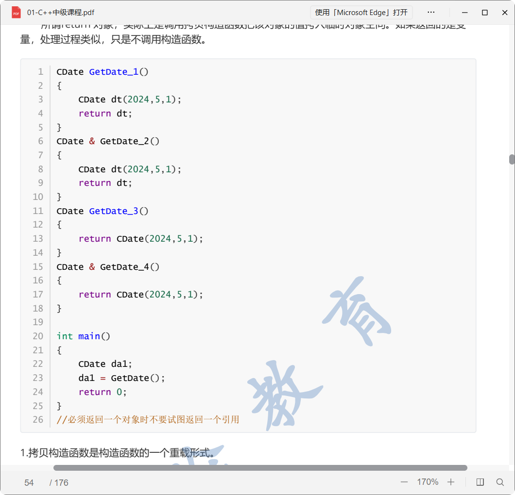 直接返回临时对象CDate(2024,5,1),编译器会优化(如 RVO 返回值优化),直接将临时对象构造在调用处的目标变量中,效率高且安全。 |