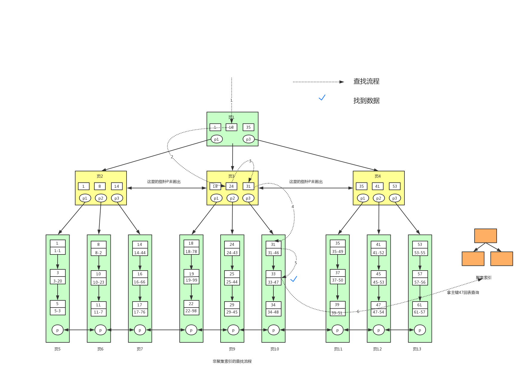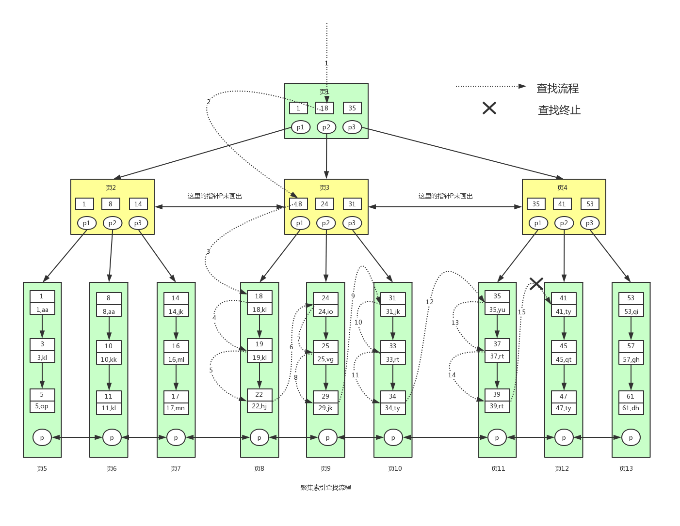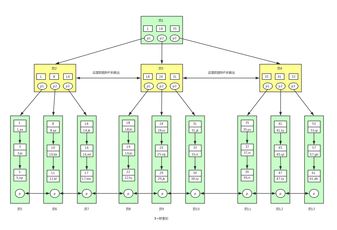 指针指向叶子节点(数据页,如 "页 10、页 12");