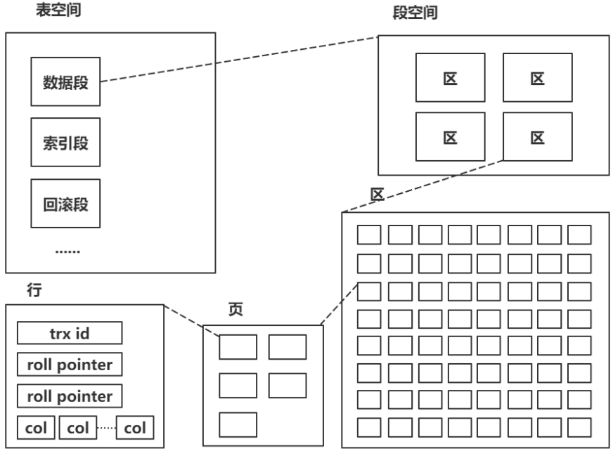 - 段:按功能分数据段(存表数据)、索引段(存索引)、回滚段(存事务回滚信息)