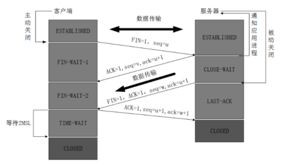 [FIN=1, seq=u]- 主动方说:"我这边数据发完了,要关闭连接。"