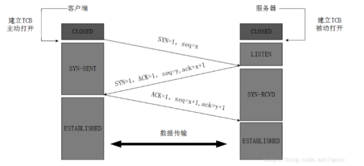 [SYN=1, ACK=1, seq=y, ack=x+1]- 服务器说:"我同意连接,我的初始序列号是y。你发的x我收到了,下次请从x+1开始发。"