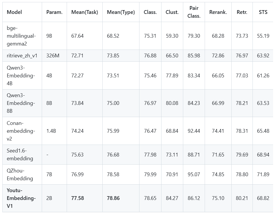 截至2025年9月28日的CMTEB基准测试结果表明,Youtu-Embedding-V1(2B参数)在当时展现出卓越的性能,在七个任务类别中均表现领先,以77.58的平均任务得分和78.86的平均类型得分位居榜首,尤其在聚类(84.27)和重排序(75.10)任务中优势明显,同时在检索(80.21)和语义文本相似度(68.82)等关键任务上也取得最佳成绩,显著优于同期的QZhou-Embedding、Seed1.6-embedding和Conan-embedding-v2等模型,实现了当时的最高整体平均分,彰显了其在该时间节点上全面且领先的中文多任务语义理解能力------但需强调,这一领先地位反映的是截至该日期的模型竞争力,技术演进将持续推动性能边界,卓越仅属于当下。