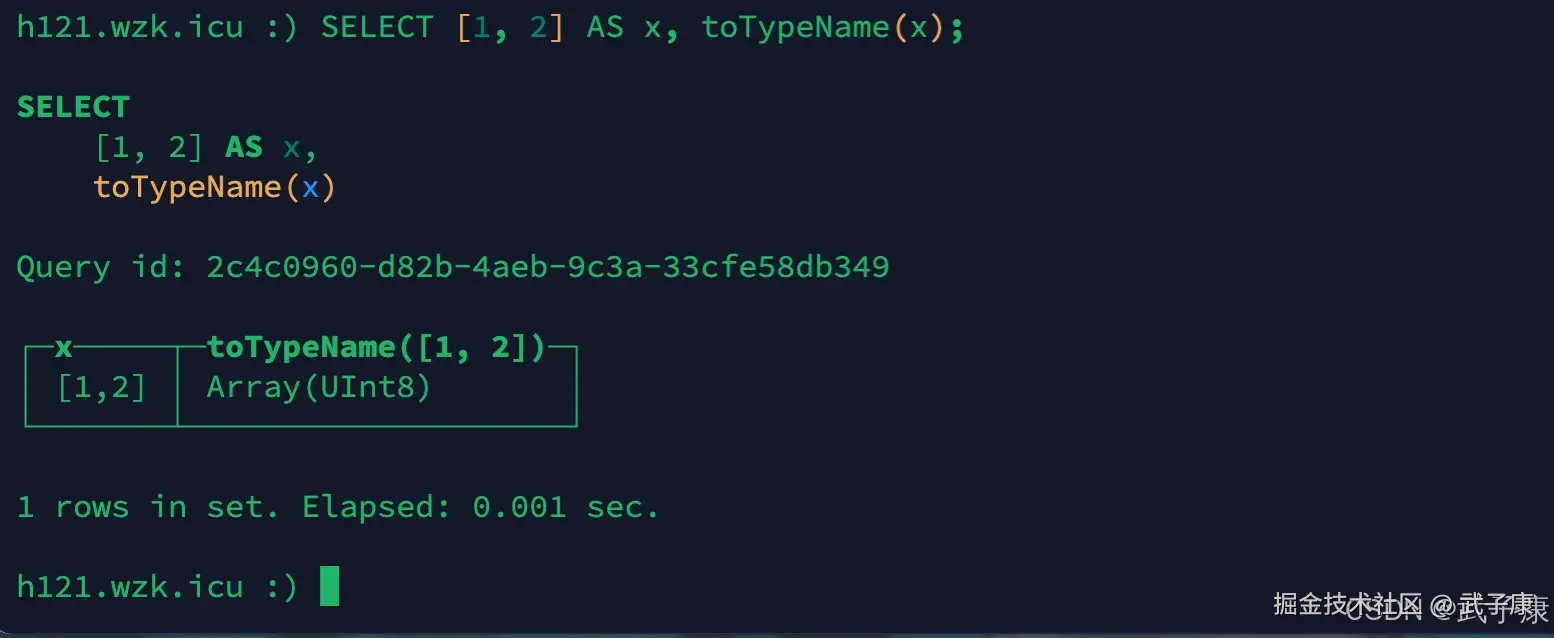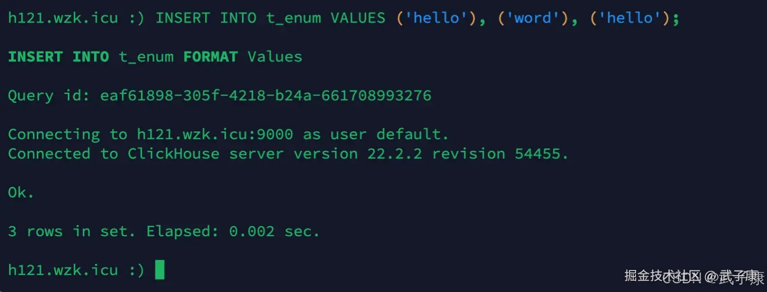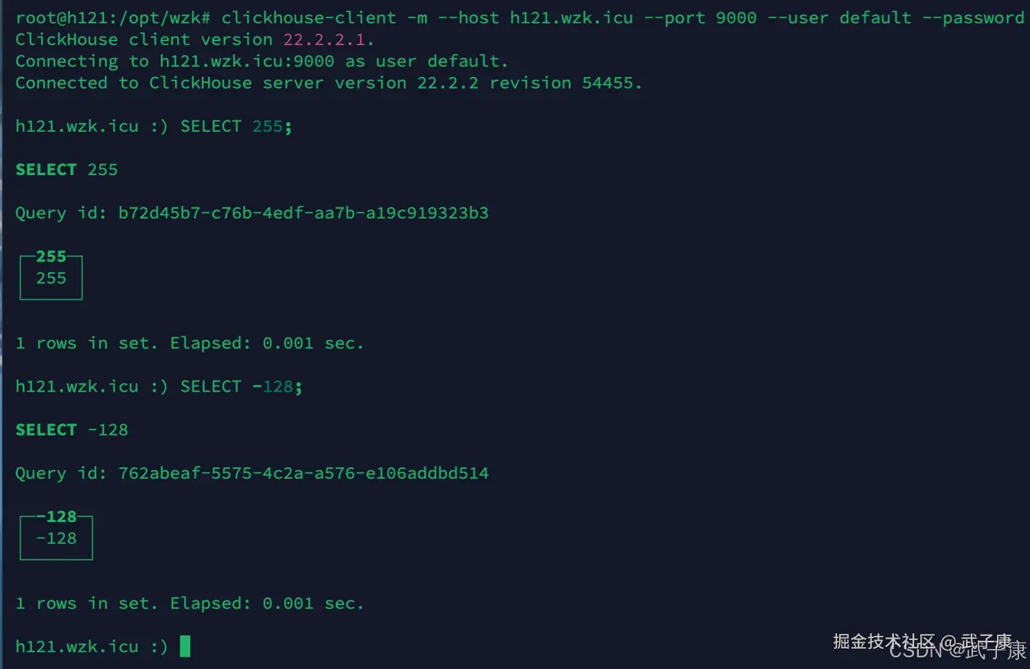 clickhouse-client -m --host h121.wzk.icu --port 9000 --user default --password clickhouse@wzk.icu