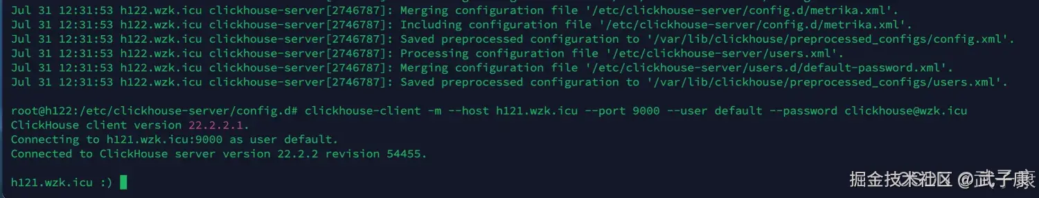clickhouse-client -m --host h122.wzk.icu --port 9001 --user default --password clickhouse@wzk.icu