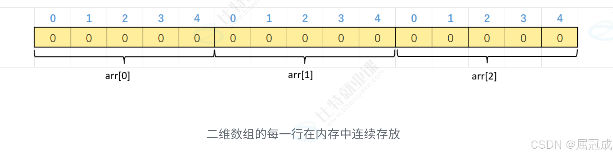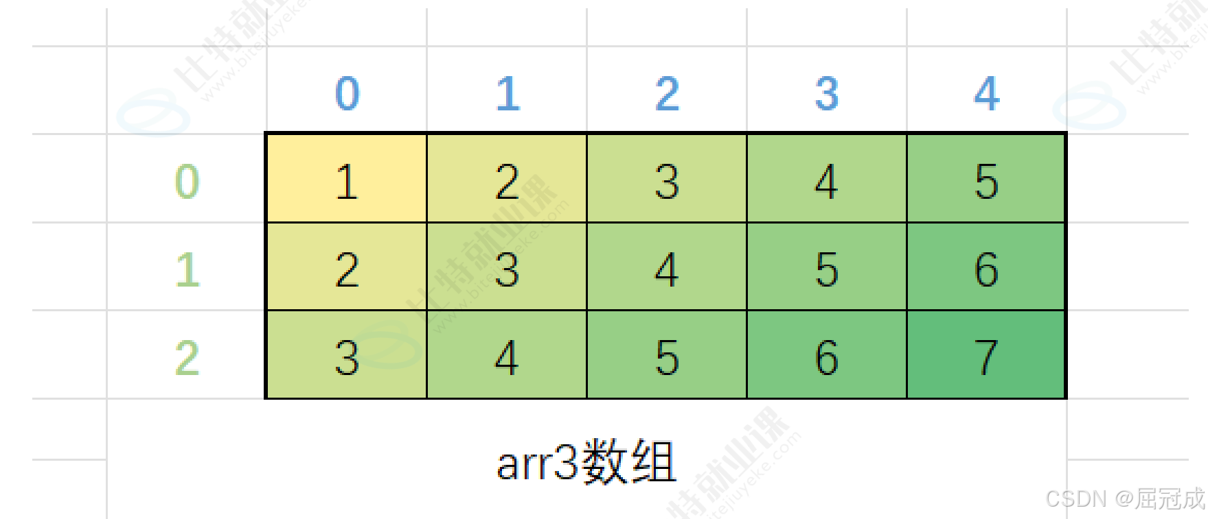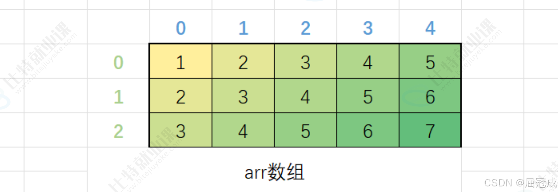 int arr[3][5] = { 1,2,3,4,5, 2,3,4,5,6, 3,4,5,6,7 };//这里我们可以把数组初始化为 int arr[3][5]={0};