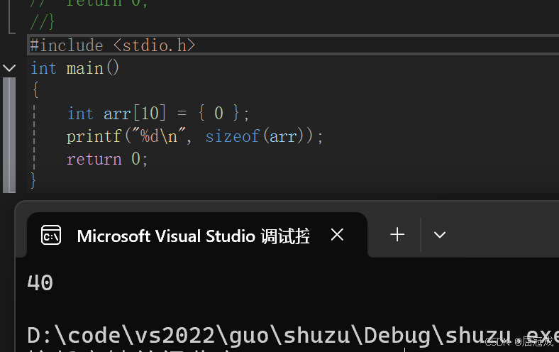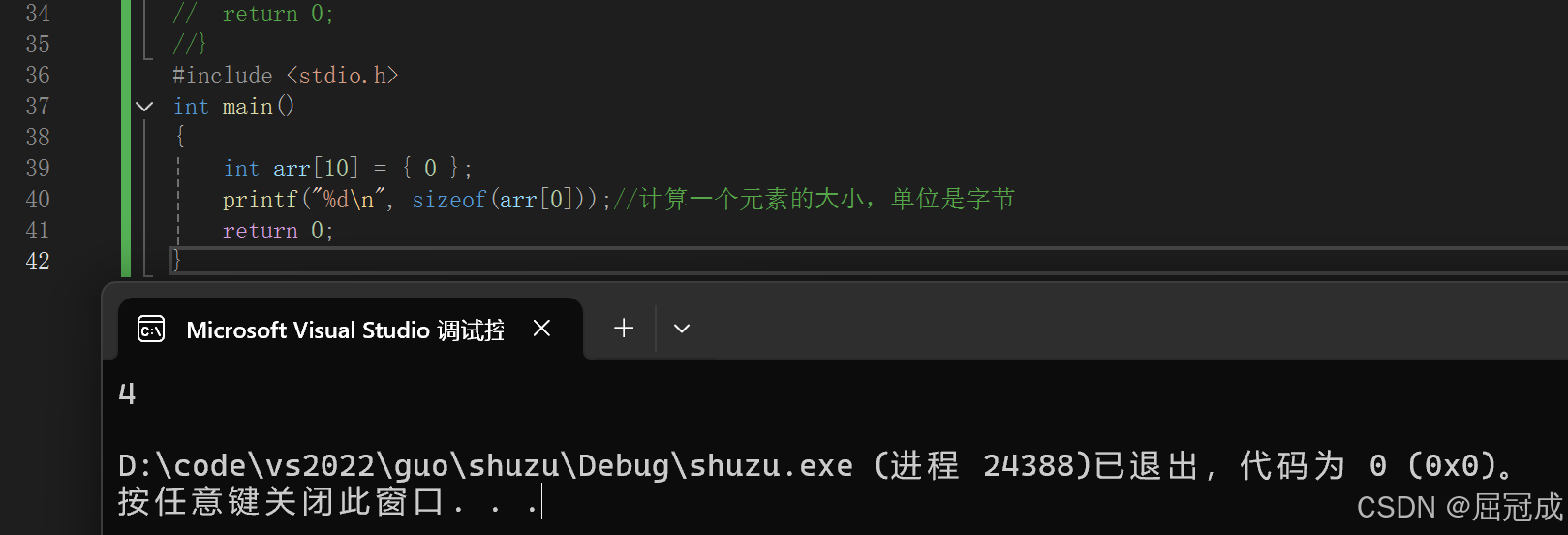 printf("%d\n", sizeof(arr[0]));//计算⼀个元素的⼤⼩,单位是字节