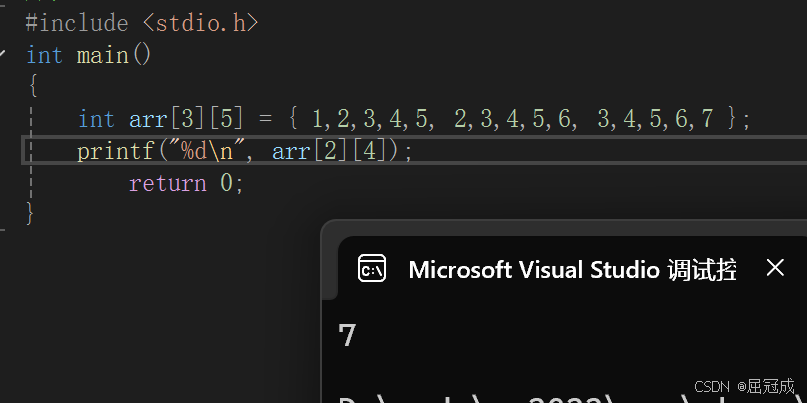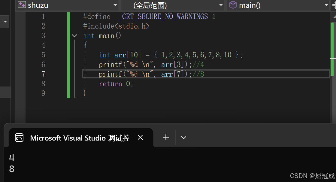 有了下标访问操作符,我们就可以轻松的访问到数组的元素了,比如我们访问下标为7的元素,我们就可以使⽤ arr[7] ,想要访问下标是3的元素,就可以使⽤ arr[3] ,如下代码: