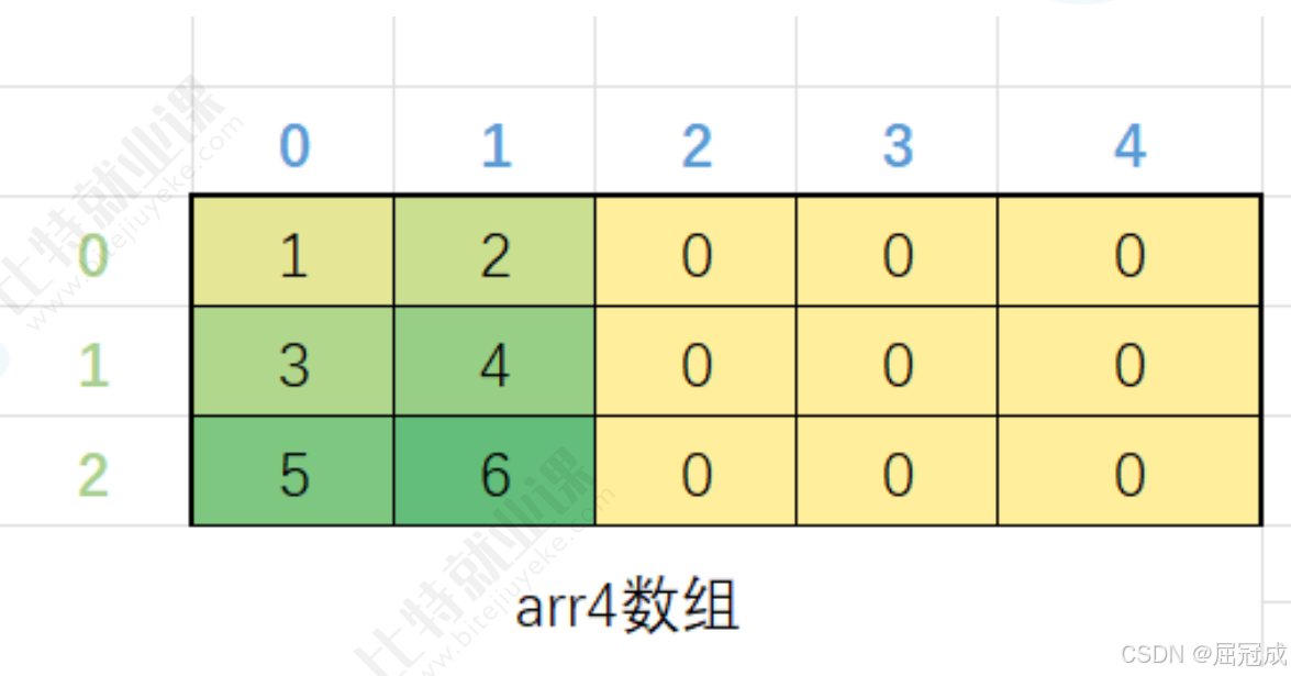 int arr4[3][5]={{1,2},{3,4},{5,6}};//一维数组也是用{}来初始化的