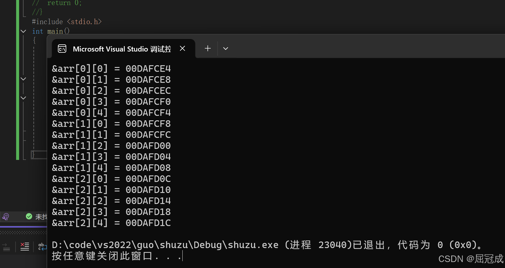从输出的结果来看,每⼀⾏内部的每个元素都是相邻的,地址之间相差4个字节,跨⾏位置处的两个元素(如:arr[0][4]和arr[1][0])之间也是差4个字节,所以⼆维数组中的每个元素都是连续存放的。