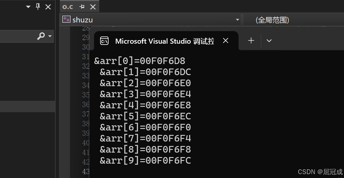 元素之间相差4(因为⼀个整型是4个字节)。所以我们得出结论:数组在内存中是连续存放的。这就为后期我们使用指针访问数组奠定了基础(在讲指针的时候我们在再讲,这里暂且记住就行)。