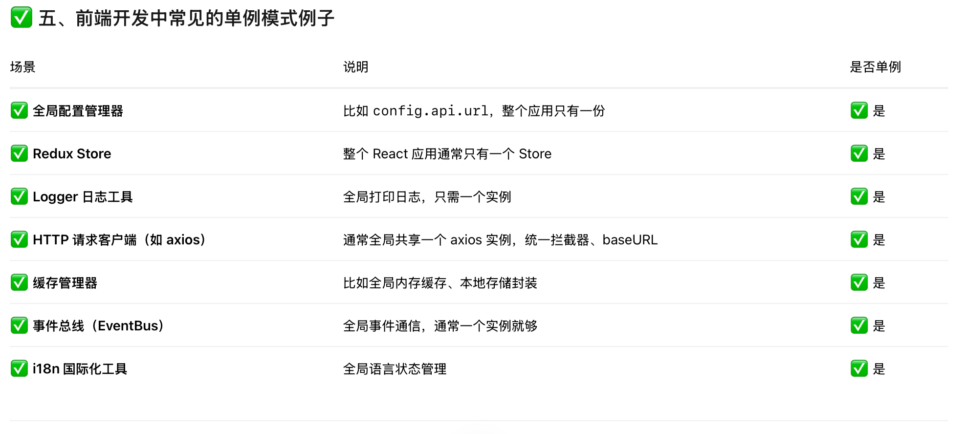 | 单例模式 | 创建型 | 全局 HTTP 客户端、Logger、Store |
