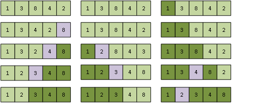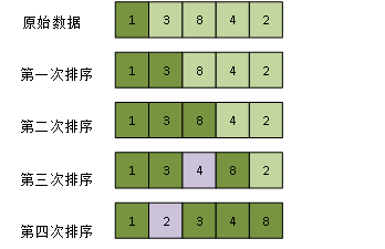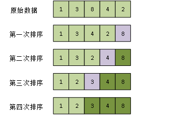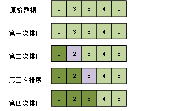 在图2中,原始数据顺序为:1、3、8、4、2,现在按照由小到大的顺序对他们进行排列: