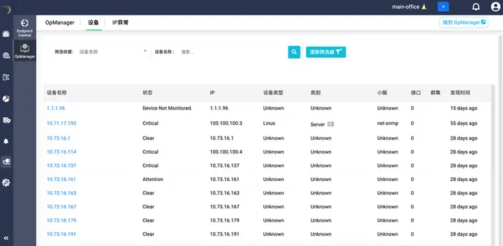 **安全:**当在流量或日志中发现一个未知IP时,可以在DDI Central中立刻确认它是否是OpManager监控清单中的受信设备。如果不是,则可立即视为可疑设备进行排查。