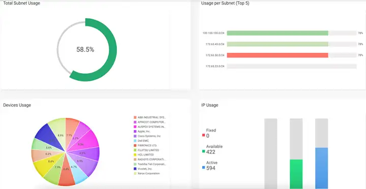 亮点描述: OpManager强大的**网络自动发现**功能(通过SNMP, CLI等)能够自动识别出网络中的设备(交换机、路由器、服务器、打印机等)及其MAC地址。这些被发现的新资产可以自动同步到DDI Central,并建议或直接分配IP地址。