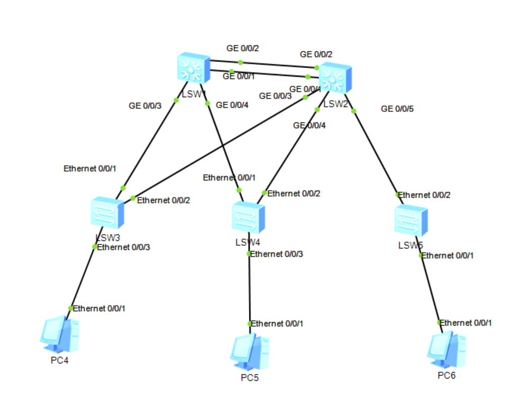 sw1-Eth-Trunk0\]port link-type trunk \[sw1-Eth-Trunk0\]p t a v 100 \[sw3-Ethernet0/0/1\]p l t \[sw3-Ethernet0/0/1\]p t a v 100 \[sw4-Ethernet0/0/1\]p l t \[sw4-Ethernet0/0/1\]p t a v 21 \[sw4-Ethernet0/0/2\]p l t \[sw4-Ethernet0/0/2\]p t a v 22 \[sw5-Ethernet0/0/2\]p l t \[sw5-Ethernet0/0/2\]p t a v 23 \[sw3-Ethernet0/0/3\]p l a \[sw4-Ethernet0/0/3\]p l a \[sw5-Ethernet0/0/3\]p l a 1. 配置MSTP协议和选举主备份根 : \[sw1\]stp enable \[sw1\]stp mode mstp \[sw1\]stp region-configuration \[sw1-mst-region\]region-name SC \[sw1-mst-region\]instance 1 vlan 21 \[sw1-mst-region\]instance 2 vlan 22 23 100 \[sw1\]stp instance 0 root primary \[sw1\]stp instance 1 root primary \[sw1-mst-region\]active region-configuration \[sw2\]stp enable \[sw2\]stp mode mstp \[sw2\]stp region-configuration \[sw2-mst-region\]region-name SC \[sw2-mst-region\]instance 1 vlan 21 \[sw2-mst-region\]instance 2 vlan 22 23 100 \[sw2\]stp instance 0 root secondary \[sw2\]stp instance 1 root secondary \[sw2\]stp instance 2 root primary \[sw2-mst-region\]active region-configuration 4.接口配置为边缘接口,并配置BPDU保护 \[sw3-Ethernet0/0/3\]stp edged-port enable \[sw3-Ethernet0/0/3\]stp bpdu-filter enable \[sw4-Ethernet0/0/3\]stp edged-port enable \[sw4-Ethernet0/0/3\]stp bpdu-filter enable \[sw5-Ethernet0/0/1\]stp edged-port enable \[sw5-Ethernet0/0/1\]stp bpdu-filter enable Vlanif的配置 \[sw1\]int Vlanif 21 \[sw1-Vlanif21\]ip add 192.168.21.1 24 \[sw1-Vlanif21\]int vlan 22 \[sw1-Vlanif22\]ip add 192.168.22.1 24 \[sw1-Vlanif22\]int vlan 23 \[sw1-Vlanif23\]ip add 192.168.23.1 24 \[sw1-Vlanif23\]int vlan 100 \[sw1-Vlanif100\]ip add 192.168.0.1 24 1. .我们假设sw1与sw2的0/0/和0/0/6接口为上行链路 配置监控 \[sw1-Vlanif21\]vrrp vrid 1 virtual-ip 192.168.21.254 \[sw1-Vlanif22\]vrrp vrid 1 virtual-ip 192.168.22.254 \[sw1-Vlanif23\]vrrp vrid 1 virtual-ip 192.168.23.254 \[sw1-Vlanif22\]vrrp vrid 1 track interface g0/0/4 reduced 15 \[sw1-Vlanif21\]vrrp vrid 1 track interface g0/0/4 reduced 15 \[sw1-Vlanif23\]vrrp vrid 1 track interface g0/0/4 reduced 15 Sw2同理 至此