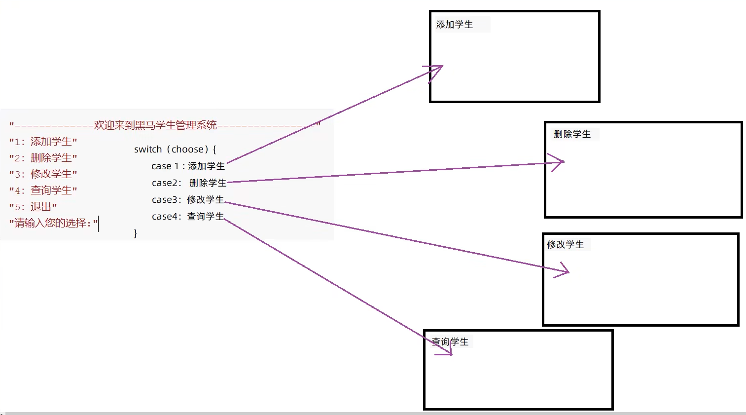 该系统分四部分内容:添加、删除、修改、查询,可以用一个选择语句来选择需要执行哪一部分,每一部分的具体执行单独用方法来写