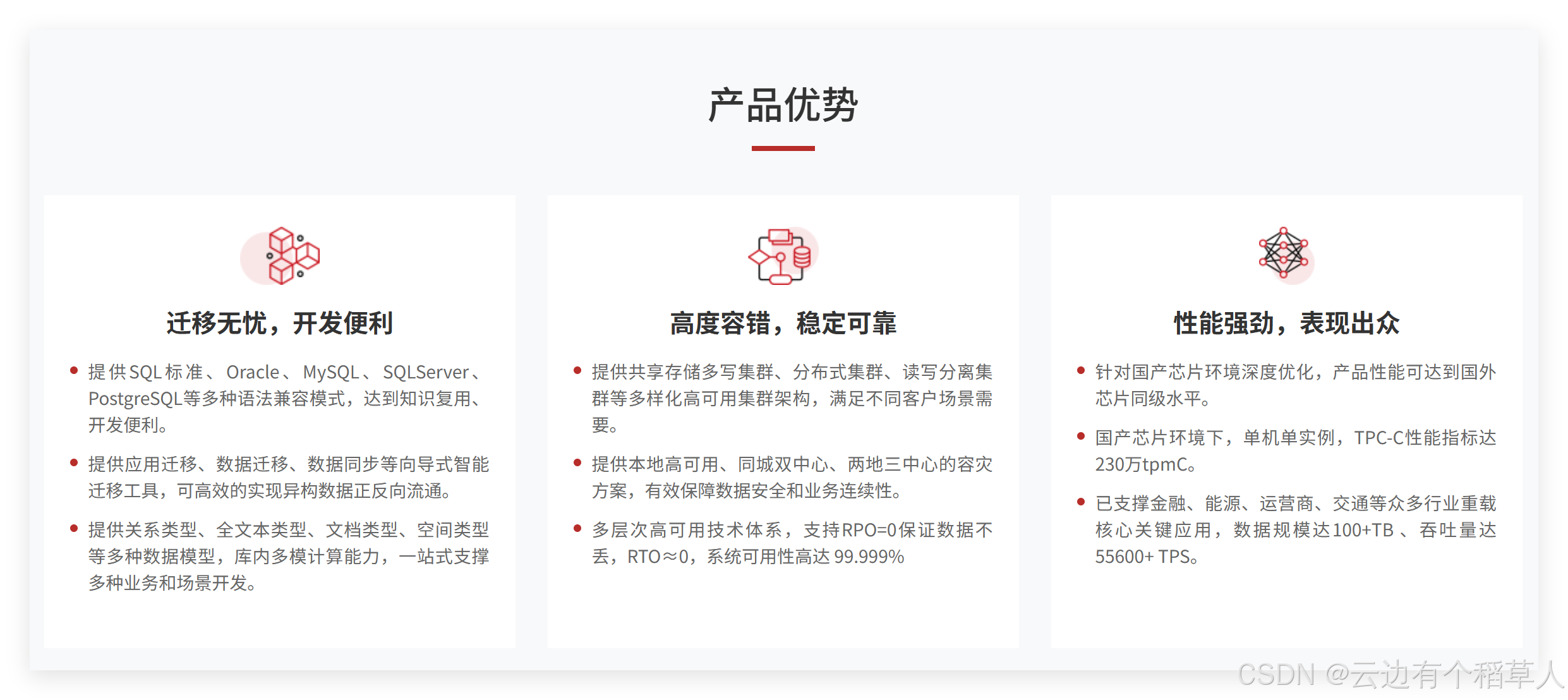 KingbaseES(简称KES)是面向全行业、全客户关键应用的企业级大型通用融合数据库产品,适用于事务处理类应用、数据分析类应用、海量时序数据采集检索类应用、要求苛刻的互联网应用等场景;可用作管理信息系统、业务及生产系统、决策支持系统、多维数据分析系统、运行日志管理系统、全文检索系统、地理信息系统、时序数据处理相关系统的承载数据库。 KES采用融合数据库架构,通过多语法体系一体化架构实现一套软件兼容Oracle、MySQL、SQL Server、PostgreSQL等多个异构数据库的语法; 采用多模数据一体化存储,支持对关系模型、文档模型、全文本、GIS数据、时序等数据的统一存储、混合访问、模型间转换; 采用集中分布一体化架构,满足不同级别的可用性,为客户提供不同级别的可用性、性能扩展、成本需求,确保业务连续,最大化投资价值。