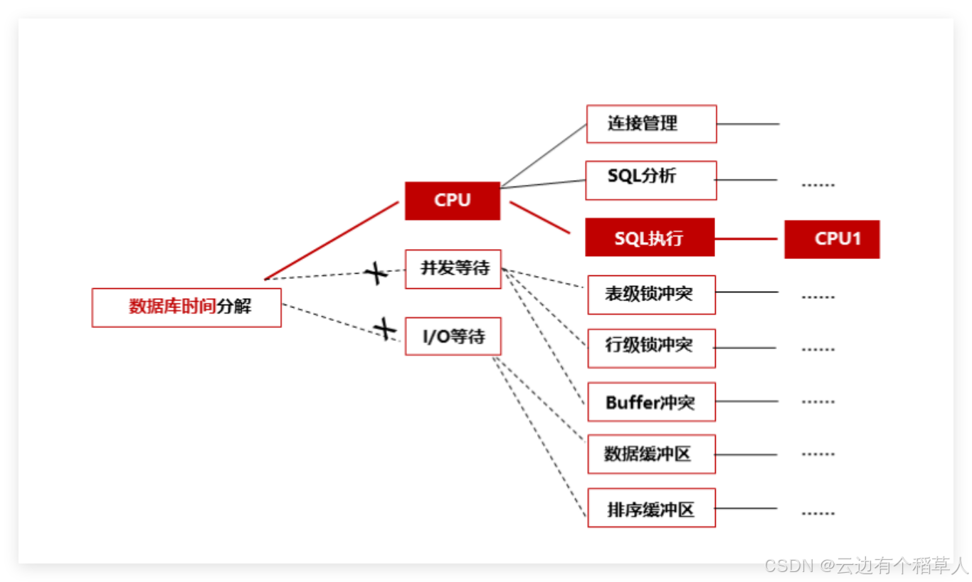 数据库请求响应时间:即一个数据库请求从向数据库发起,到用户收到最后一条结果数据的时间间隔,其大小 = CPU计算时间 + 非空闲等待时间(如IO时间、数据库锁时间)。