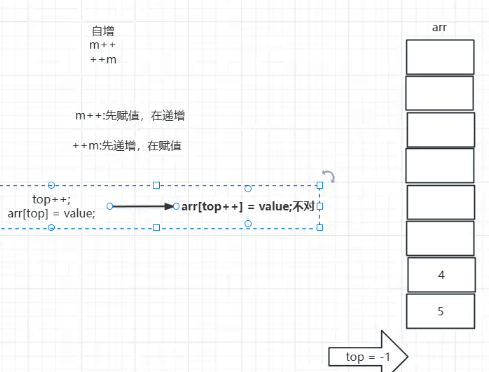 top++和数组arr的操作,说明栈结构的元素入栈逻辑。top++是先使用当前top值再递增,而arr[top++] = value的写法是错误的,正确的逻辑应是先确定位置再赋值(arr[++top]=value。右侧的数组arr和top = -1(栈的初始指针位置),进一步辅助理解栈的初始化和元素存储(如数组中已有的 4、5 元素)。