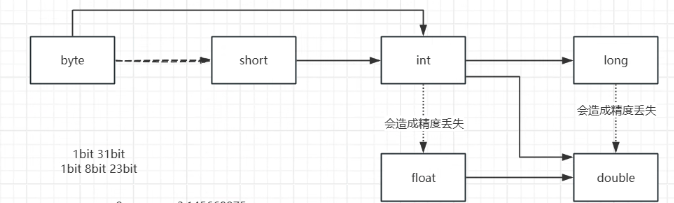 int转换为float、int转换为double(实际通常不会丢失,但图中提示需注意)、float转换为double(实际一般不丢失,可能图中强调转换特性)时,会因浮点数的存储机制(如有效位数)造成精度丢失。而byte到short的转换是虚线,可能表示需要注意符号扩展等细节。