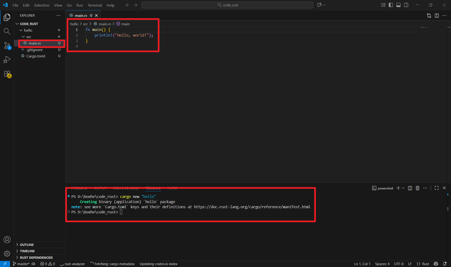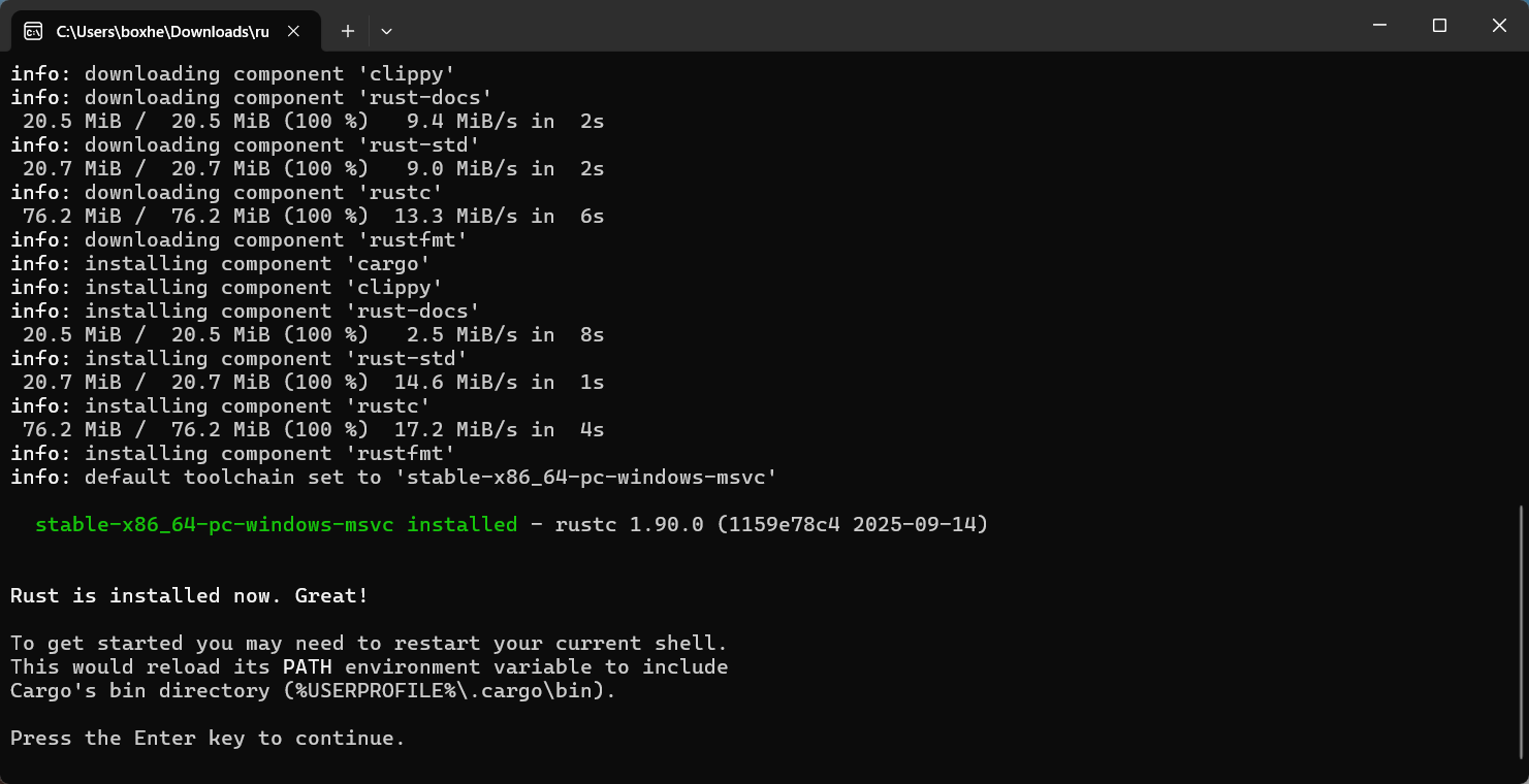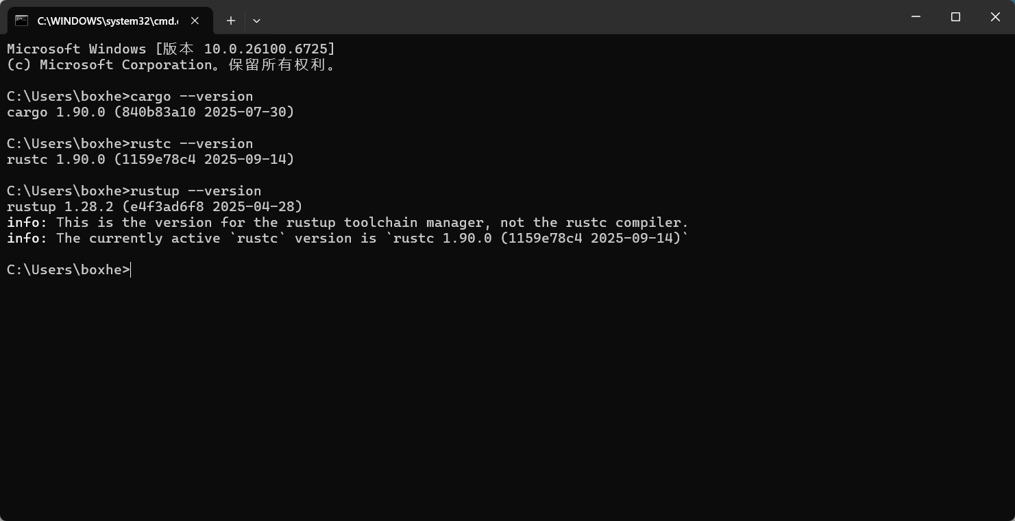 如果成功输出,说明Rust环境已经配置成功了,现在你的电脑已经可以编译Rust程序了。