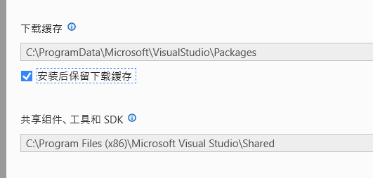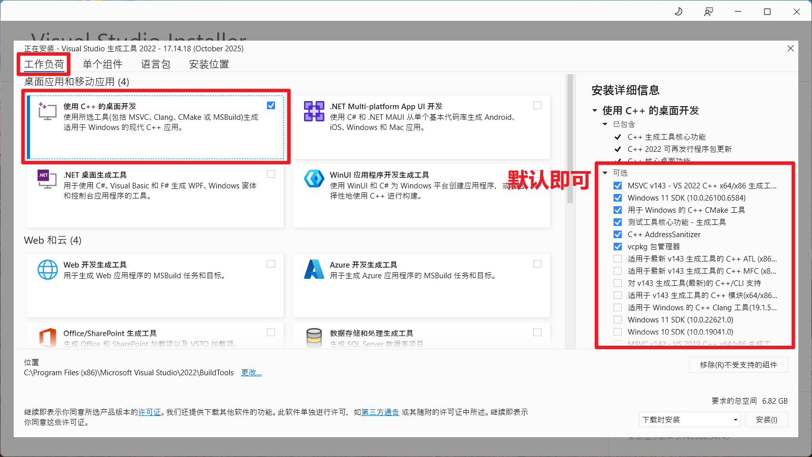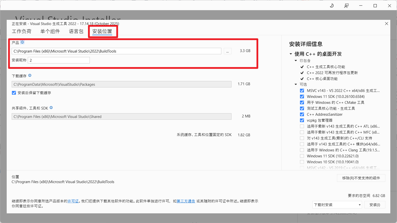 选择"使用 C++ 的桌面开发",右侧的可选项默认勾选即可,这个程序默认安装到C盘,如果C盘不够大,可以在顶部"安装位置"部分修改: