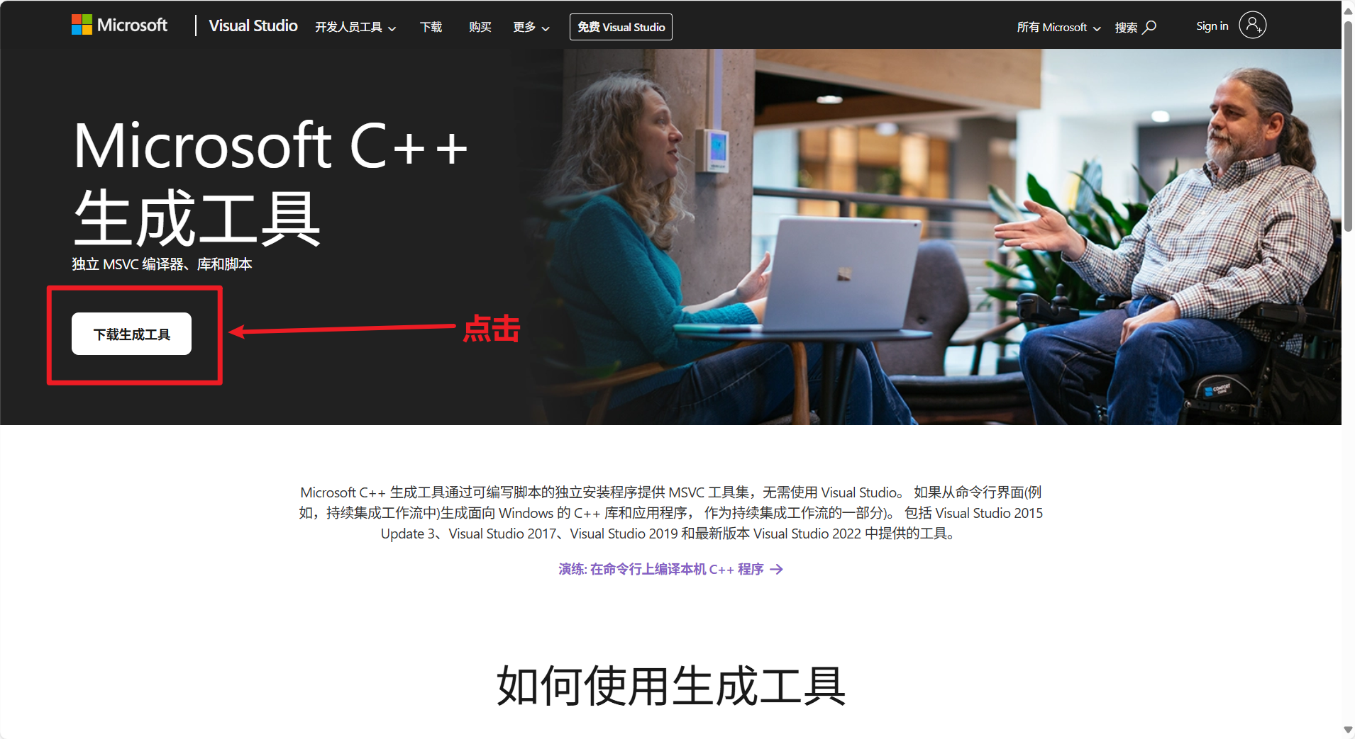 点击"下载生成工具",此时你会得到一个叫做"vs_BuildTools"的可执行程序。