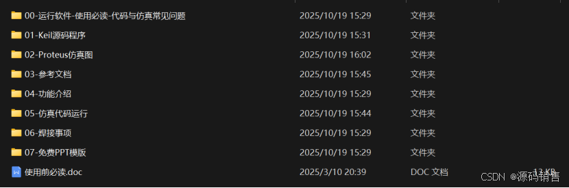 2、压缩包构造:代码与仿真常见问题、Keil源码程序、Proteus仿真图、参考文档、功能介绍、仿真代码运行、焊接事项、免费PPT模版、使用前必读。