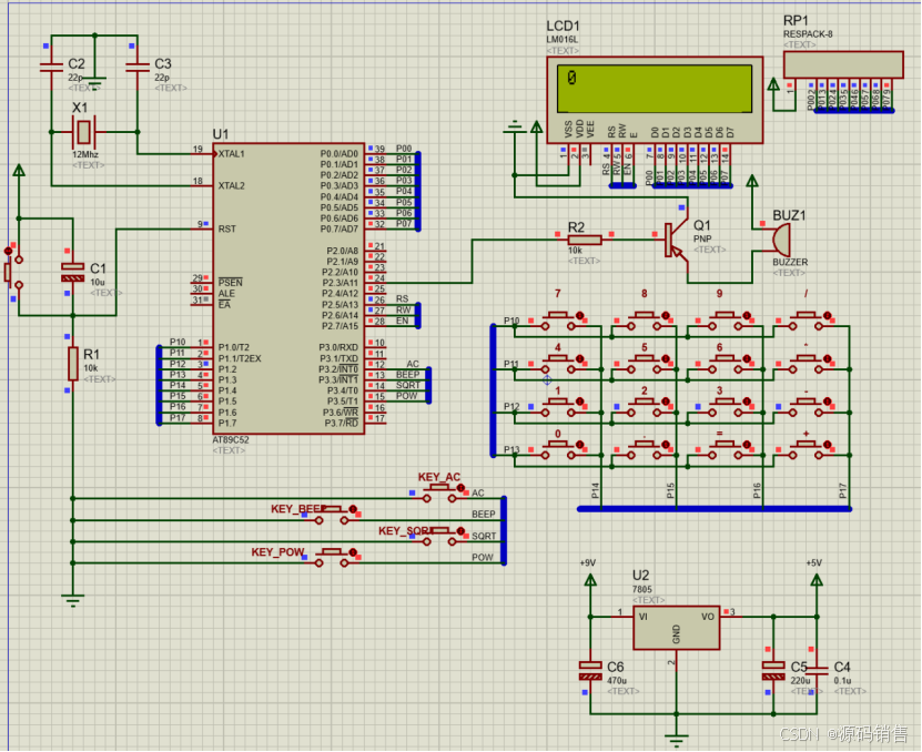 3、仿真构造:AT89C52、20个按键、LCD液晶显示、蜂鸣器。