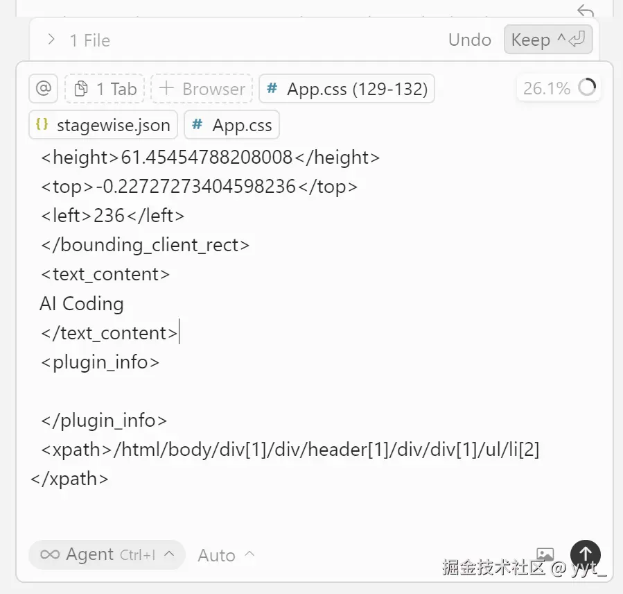 选好要调整的UI元素后,就可以在工具栏中输入要调整内容的提示词了, 选中元素后,Stagewise 会自动分析该元素的 DOM 结构、CSS 样式、类名、层级关系等上下文信息,并将这些可视化的渲染结果转化为 AI 可理解的结构化描述。
