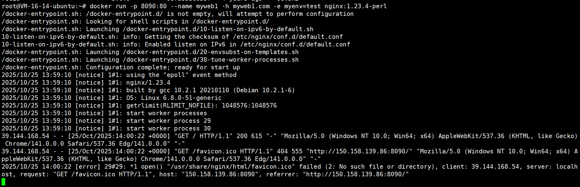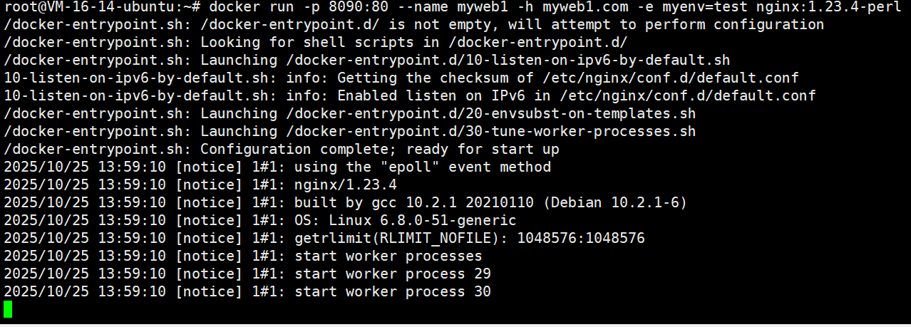 docker run -p 8090:80 --name myweb1 -h myweb1.com -e myenv=test nginx:1.23.4-perl