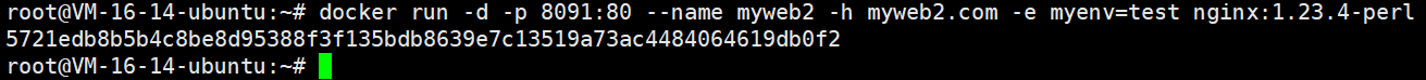 docker run -d -p 8091:80 --name myweb2 -h myweb2.com -e myenv=test nginx:1.23.4-perl