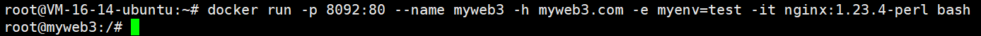 docker run -p 8092:80 --name myweb3 -h myweb3.com -e myenv=test -it nginx:1.23.4-perl bash