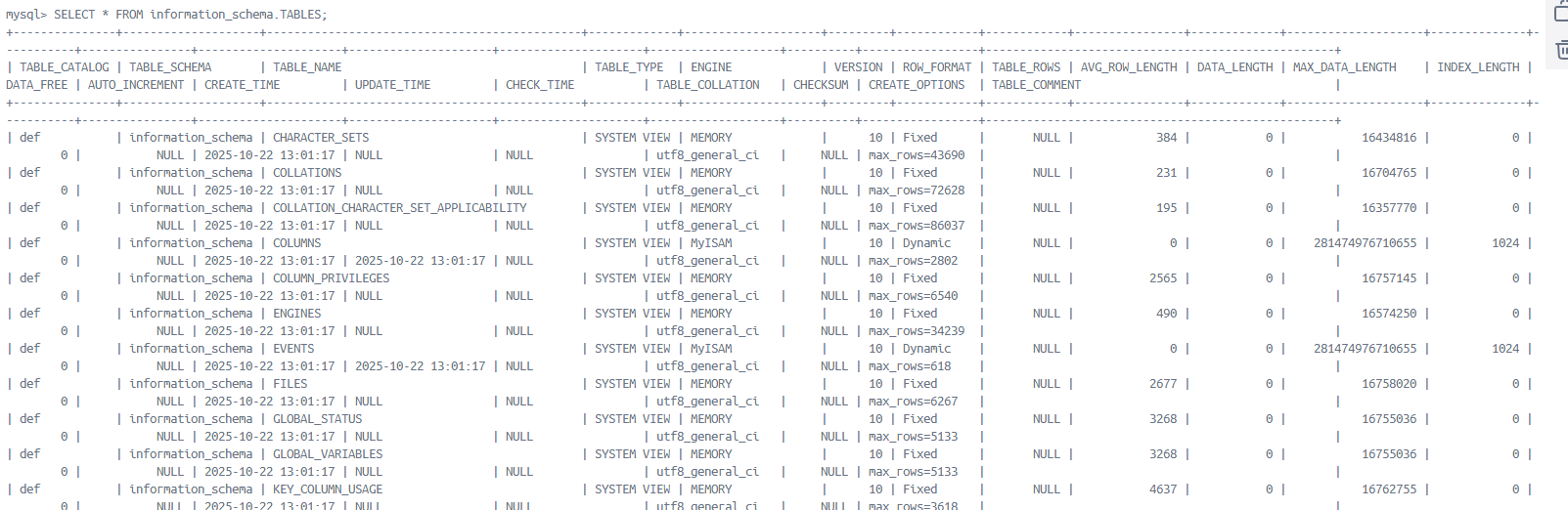 SELECT * FROM information_schema.TABLES;