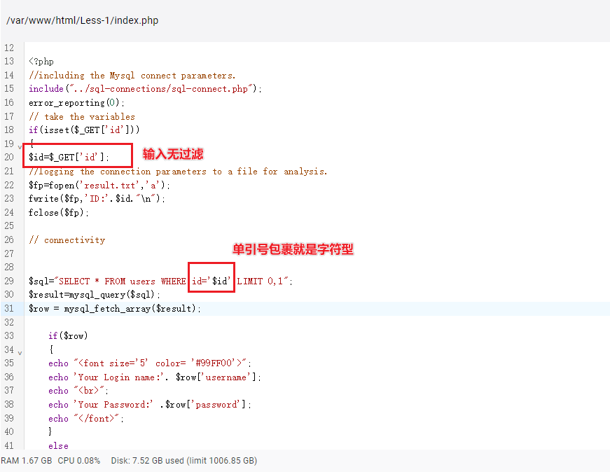 docker进入靶机查看less1的php文件,发现数据库查询的语句主要是下面这句话