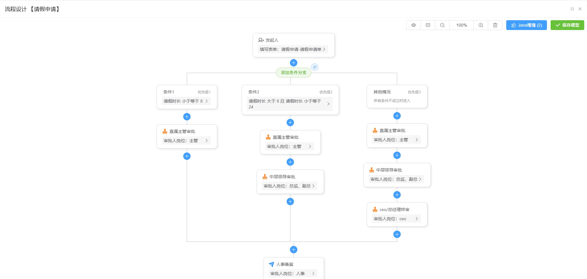 | 条件分支、包容分支组件 | 通过已填写的表单数据判断流转分支 自定义Java方法判断流转分支 |